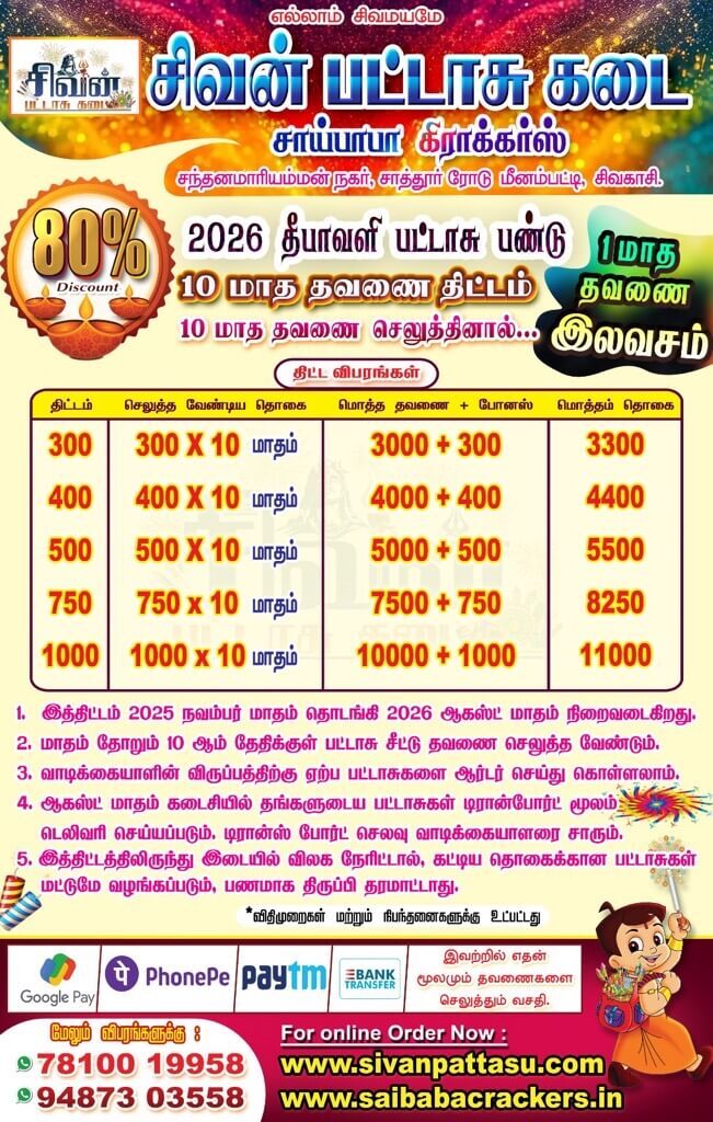 Sivan Pattasu sells high-quality fancy crackers for retail and wholesale price. We directly deliver it from the company. No second sale. We are a wholesale dealer and retail dealer of top-quality Sivakasi crackers. Our crackers are the best in quality and have more than 500 hundred varieties of special crackers, Fancy Crackers, Kids Crackers, Marriage Crackers, and Gift Boxes. To order crackers sivan pattasu